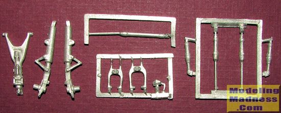 This Scale Aircraft Conversions set is for the recently released Kinetic 1/48 Mirage III/V family of aircraft. The set is quite complete and includes main and nose gear legs with two widths of nose wheel fork. Retration struts are encased in metal sprues to help keep them from being damaged and are easily removed. The molding on this set is very good and these pieces are direct replacements for the kit gear.