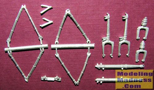 This Scale Aircraft Conversions set is for the New Hobby Boss 1/48 Ka-28 'Helix' helicopter. The set is actually pretty complex, consisting of four main gear vee struts with a thicker shock strut on each side. Attached to these are the actual gear legs. For the front are two smaller struts. I think the oleo scissors are for the front. There are also two smaller pieces joined by a metal sprue. As I don't have the kit, I'm not sure where they fit. However, this set is a direct replacement for the kit parts so figuring out where they go should not be an issue. The set is nicely molded and something you should consider if you have this kit.