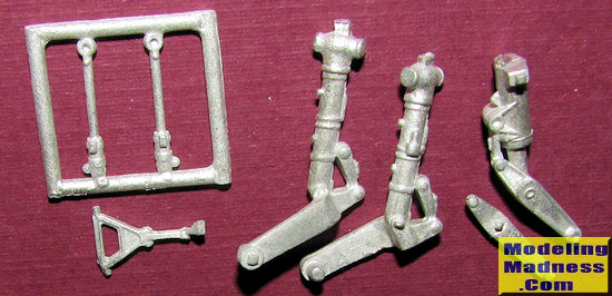 This Scale Aircraft Conversions set is for the Trumpeter 1/48 Su-11 Fishpot. This set is a correction set as the kit gear legs are not molded at the correct angle and this set fixes this issue. The gear is actually quite sturdy and basic. There are two main landing gear legs along with their retraction struts. The nose gear has a separate section to allow the attachment of the nose wheel. There is a smaller retraction strut for this as well. The set is nicely cast and a direct replacement for the kit parts.