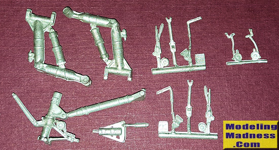 This Scale Aircraft Conversions set is for the Kinetic 'Legacy Hornets', the F-18A-D in 1/48 Scale. The set is quite complete with all the usual mass of struts and links found on the real aircraft. Note that the nose gear strut has the launch bar molded in the raised position. These are nicely molded and are direct replacements for the kit parts.