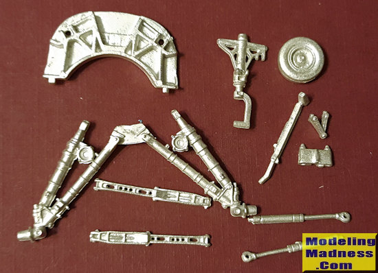This Scale Aircraft Conversions set is for the Kinetic 1/48 F-16. This set is for the 'light' variants; basically the -1 to -20 versions or the F-16A/B variants. You can tell these by the landing lights on the main landing gear. The set includes the aft gear bulkhead along with the retraction struts. The nose gear includes a separate nose gear and its retraction strut and oleo scissor. The rectangular looking thing is a nose gear door landing light, an item generally not used with this aircraft. These are nicely molded and are direct replacements for the kit parts.