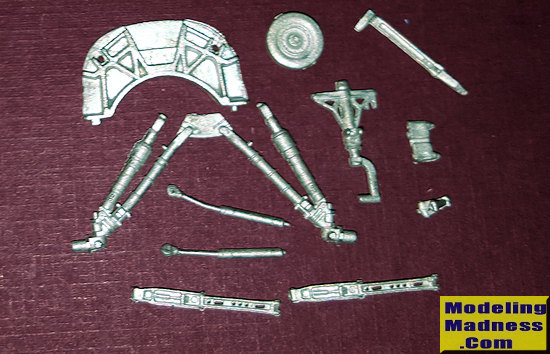 This Scale Aircraft Conversions set is for the Linetic 1/48 F-16. This is used for the later F-16s that have the beefed up landing gear and wheels. The 'heavy' variants can be spotted by the lack of landing lights on the main gear struts. With these planes, this was moved to the nose gear door. Always check your references to be sure of these changes. You get a new gear bulkhead, main gear, and the usual struts. A nose gear, separate wheel, retraction strut and oleo scissors along with the nose gear door landing lights is part of the package. These are nicely molded and are direct replacements for the kit parts.