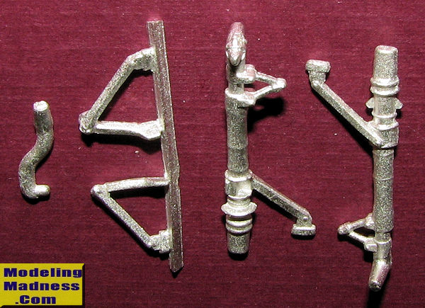 This Scale Aircraft Conversions set is for the recent Airfix 1/48 P-40B/C kit. The set is pretty simple consisting of the two main gear legs, the two retraction strut pices which are on a metal sprue, and the tail gear strut. These are direct replacements for the kit parts and are nicely molded. Don't worry about what looks like roughness on the surface of the parts. This is typical of all cast metal bits and will disappear once painted.