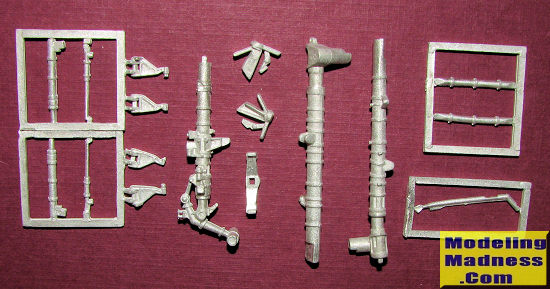 The recent release of the Kitty Hawk 1/48 Su-35 Flanker E has resulted in Scale Aircraft Conversions producing a replacement set for this kit in metal. This is not a simple landing gear so there are a considerable number of small struts and other bits. The set includes separate oleo scissors with the smaller bits encased in metal sprues for protection. These are direct replacements for the kit parts and are nicely molded.
