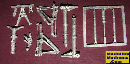 This Scale Aircraft Conversions set is for the Hobby Boss 1/48 MiG-31 'Foxhound'. It seems like the requirement to run planes from unimproved surfaces results in complex landing gear and this is no exception. There are three pieces to the nose gear plus a retraction strut. The main gear have Two major parts along with their retraction strut. As with most SAC sets, these are direct replacements for the kit parts and like all their sets are nicely molded.