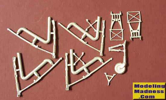This Scale Aircraft Conversions set is for the new ICM 1/48 He-111H. The packet also says it will work on this kit boxed by Revell and Hasegawa. I would have thought that Revell would use the Monogram mold, but there you have it. This set is fairly complex with four main gear struts and the central linkage. There is also a tail gear strut with built in wheel and its brace. These are direct replacements for the kit parts and are nicely molded.