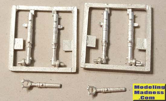 This Scale Aircraft Conversions set for the Eduard 1/48 Spitfire IXc. Typical of a Spitfire, the set is reather minimalist, consisting of but the two main gear legs and a tail gear. You get two full sets in this pack so that is a nice feature as if you'll use one set, you'll undoubtedly use another later. These are direct replacements for the kit parts and are nicely molded.
