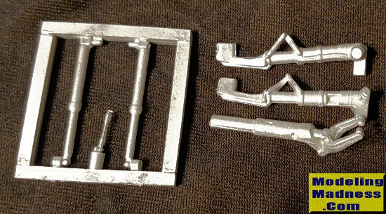 This Scale Aircraft Conversions set for the Airfix 1/48 Hawker Hunter. This is a pretty standard aircraft so you get two main gear legs, a nose gear leg, and two retraction struts for the main gear. Not sure what the small strut is for, but perhaps it is the nose wheel steering strut or some other strut for the nose gear. These are direct replacements for the kit parts and are nicely molded.