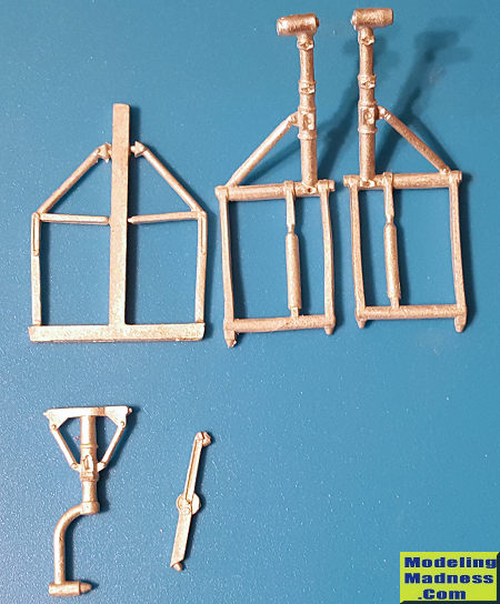 This Scale Aircraft Conversions set for the recent ICM 1/48 A/B-26 Invader. The set includes the main landing gear and braces encased in metal sprues. The nose gear and the strut for it are also provided. These will probably not fit the Monogram kit as I believe SAC already does gear for that kit. These nicely cast parts are direct replacements for the kit parts.