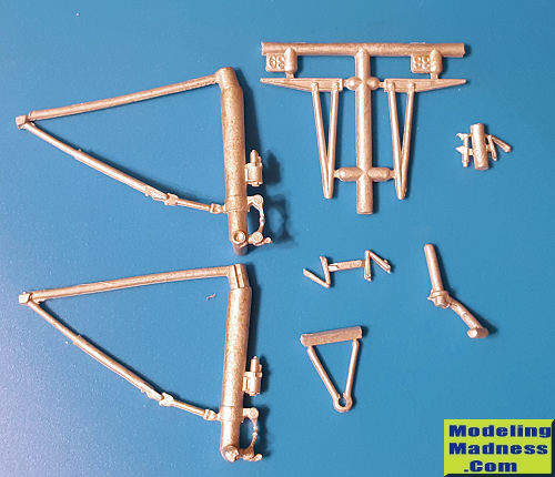 This Scale Aircraft Conversions set for the recent HK Models 1/48 B-17 Flying Fortress. The set includes a pair of beefy landing gear with attached strut. an additional main gear strut plus the separate oleo scissors. The tail gear has a few additional bits to add to it as well. These are direct replacements for the kit parts and are nicely molded.