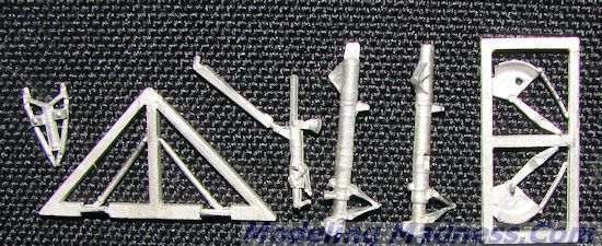 This Scale Aircraft Conversions set is for the Zvezda 1/72 Su-27 Flanker. The set includes the nose gear strut and two main landing gear struts plus what I believe is an upper strut section for the nose gear. In the triangular sprue are main gear retraction struts. In the other are the splash guards and mounting for the nose landing gear. Like most SAC gear, this set is nicely molded and is a direct replacement for the kit parts.
