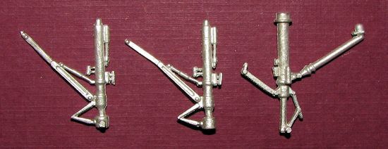 This Scale Aircraft Conversions set is for the Hasegawa 1/72 F-14 Tomcat. As many of you know, Hasegawa has issued two Tomcat kits in this scale. The earlier one was a much simpler kit and is still available as is the later one that was more complex. I believe that the landing gear in both kits is the same so this set should fit them both. The set is not complex and contains the three landing gear struts. The nose gear is in the static position and not compressed as it would be for take off. The set is very nicely molded and a direct replacement for the kit parts.