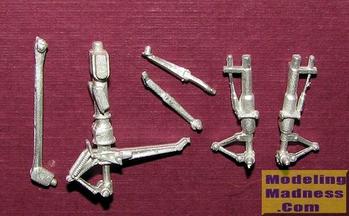 This Scale Aircraft Conversions set is for the Revell 1/72 Rafale M kit. It must be pretty new as I don't recall seeing it, though it may be an Italeri rebox. Typical of a naval aircraft it has a very beefy nose gear and retraction strut. The two main gear legs are not exactly thin and come with their retraction struts. The set is nicely cast and is a direct replacement for the kit parts.