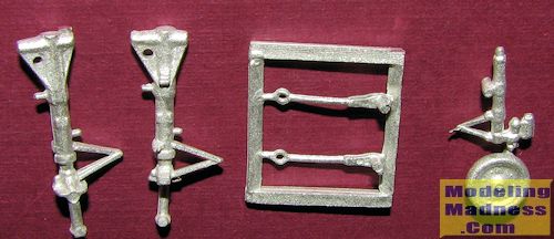 This Scale Aircraft Conversions set is for the recent Wolfpack 1/72 T-2C Buckeye. The Buckeye is a pretty basic aircraft and so it is with this gear set. There are two main landing gear legs with their retraction struts. The nose wheel is molded in with the complete nose gear. The set is nicely cast and is a direct replacement for the kit bits