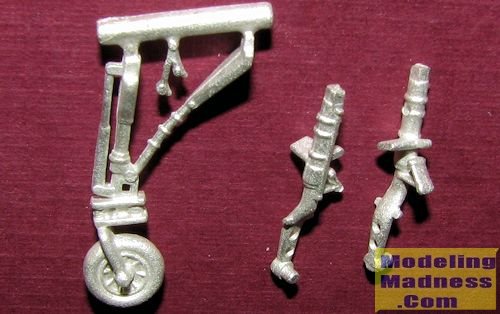 This Scale Aircraft Conversions set is for the Academy 1/72 F-84E/G Thunderjet. This is not a new kit, but is one that is quite nicely done. Apparently, this kit has also been reboxed by Italeri. THins is a pretty basic set that consists of the nose landing gear leg with a molded in nose wheel. There is a separate nose gear oleo scissor on the small metal fret. Both main landing gear are complete and ready to install. The set is nicely cast and is a direct replacement for the kit bits