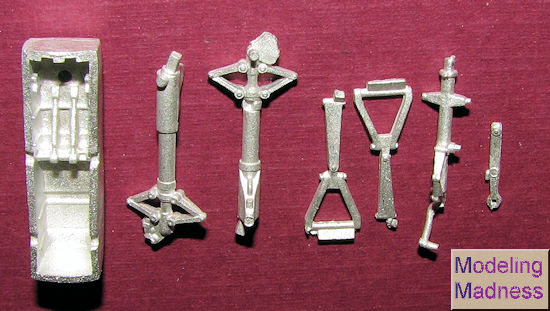 This Scale Aircraft Conversions set is for the Tamiya 1/72 F4D-1 Skyray. This is a kit that has been around for quite a while. The set consists of a new nose gear well, main gear legs with their retraction struts, a nose gear leg and its retraction strut. There should be a small second side to the nose fork, but I dropped it and didn't find it until I'd taken the photo. This set is a nicely cast and a direct replacement for the kit bits.