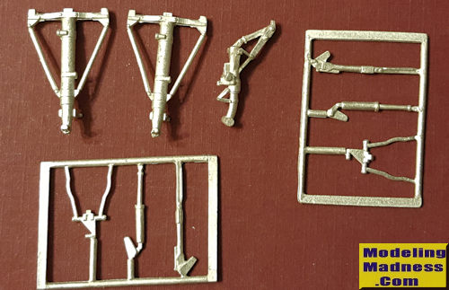 This Scale Aircraft Conversions set is for the Meng 1/72 F-106 Delta Dart. There are three separate castings and two sets in metal sprues. The former consists of the main and nose gear legs while the other consists of all the various struts for the main landing gear as well as the piece that attaches to the main gear doors. If you are wondering if these will fit the Hasegawa kit, they are certainly not designed for it so any attempt to use these on that kit will be purely experimental. These are nicely molded and are direct replacements for the kit parts.