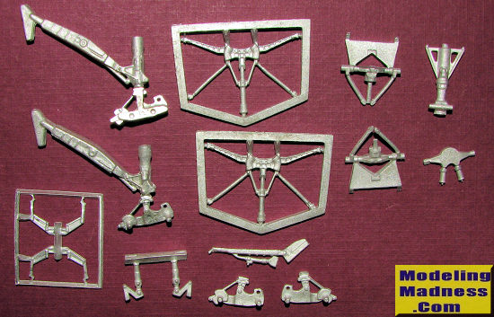 This Scale Aircraft Conversions set is for the new Airfix 1/72 Victor jet bomber. The Victor is a large and complex aircraft and Airfix's new kit matches that complexity (which it should for $75.00 SRP). So it should be no surprise that the landing gear for it comprises a lot of parts. As you can see from the image, you get all you need for the nose gear in addition to the main landing gear. These are direct replacements for the kit parts and are nicely molded. Being metal should also help to keep this large kit on its legs!