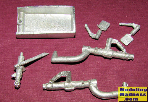 This Scale Aircraft Conversions set is for the new Valom 1/72 B-45A or RB-45C Tornado. The set is quite hefty and include a metal nose gear well which should help keep the kit off its tail. There are two main gear struts plus oleos and a new nose gear strut. These are direct replacements for the kit parts and are nicely molded.