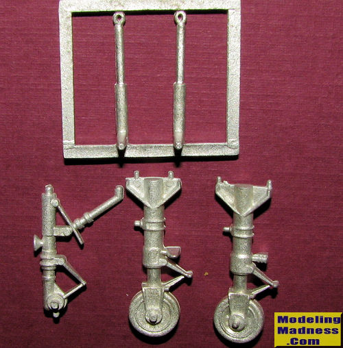 This Scale Aircraft Conversions set is for the venerable Italeri/Testors SR-71 and YF-12A Blackbirds. The set Is limited to the front nose gear along with the two main gear struts and retraction struts. Note that the main gear have the center of the three wheels molded in place. These are direct replacements for the kit parts and are nicely molded.