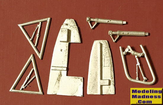 This Scale Aircraft Conversions set for the S&M or AMP 1/72 Canberra B.2/6 or T.4/11. I have to assume these are the same tooling, though the S&M kit is apparently British while the AMP kit is from Ukraine. As Canberras are notoriously tail heavy, SAC has provided two of the replacement nose parts as ballast. The other five parts are main gear and retraction struts, but a one piece nose gear assembly. These are direct replacements for the kit parts.