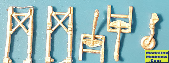 This Scale Aircraft Conversions set is for the new Airfix 1/72 Wellington I kit. The set includes new main landing gear legs with their large retraction strut assemblies and a tail gear/wheel piece. These are direct replacements for the kit parts and are nicely molded.
