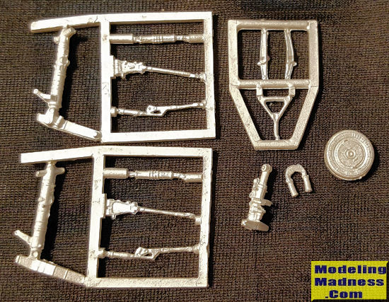 This Scale Aircraft Conversions set for the full family of Su-17 kits by Modelsvit in 1/72 scale as molded in 2014. The set contains the typically complex Soviet jet landing gear with the main gear and most of the various struts being encased in metal sprues. The nose gear, wheel fork and nose wheel are separate items with a smaller sprue holding a few more strut sections. These are direct replacements for the kit parts. Like all SAC sets, they are nicely molded.