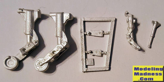 This Scale Aircraft Conversions set for the new tool Airfix 1/72 Blackburn Buccaneer.. This set provides the two beefy main landing gear along with the nose gear, retraction strut and a couple of parts that appear to be nose gear doors. Nice thing about white metal is that the nose gear forks can be molded as one piece. They can be easily bent slightly open to accept the nose wheel and then pushed back into shape. These are direct replacements for the kit parts. Like all SAC sets, they are nicely molded.
