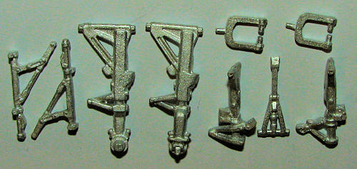 This Scale Aircraft Conversions set is for the brand new Kinetic 1/48 F-5A Freedom Fighter. This kit and set also can make the somewhat different CF-5A and NF-5A. The set includes the main gear strut and their retraction struts. It also has the two different nose gear legs; one for a standard F-5A and the other for the CF/NF-5A. A retraction strut is included along with the lower nose gear fork. This kit has two of them, though you will really only use one with your kit. These bits are replacements and additions to the kit parts.