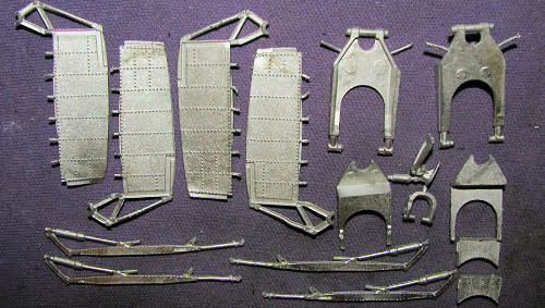 This Scale Aircraft Conversions set is for the new Revell 1/72 Halifax. As you can see, this is a rather complex set that appears to include the inside of the wheel wells as major components. There are the sturdy main gear pieces as well as retraction struts and what look to be some sort of mud guard. Wish I could tell you more, but I do not have the kit. There is also a tail wheel strut and tail wheel fork.