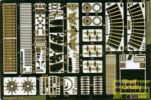 This is one of Shelf Oddity's complete etched detail sets. What you see is for the Revell 1/144 F-15A/C/E Eagle. There are a lot of parts to this one and it includes both styles of exhaust, two different styles of instrument panels along with the rear panel for the E version. Also for the E are bomb racks for the conformal tanks. There are also wheel and landing gear details as well as cockpit details and etched landing gear doors along with a number of other external and internal details.