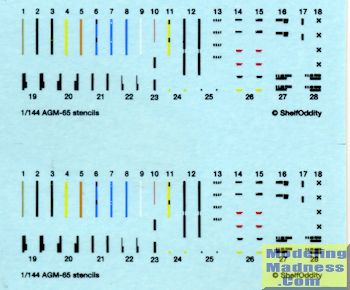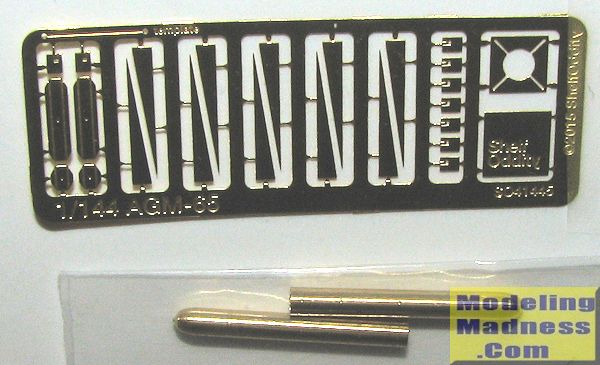 This set is a pair of brass AGM-75 Maverick air to ground missiles in 1/144 scale. Each missile is a bit under 16mm in length and consists of a solid brass body with etched fins, and some of these are seriously small. I am pleased to see some extras included. The large bits on the left are the sections where the missile attaches to the pylon. You'll notice in the image that there is panel line detail in the body as well as the attachment indentations. Included with each set is a guide to assist in getting the fins properly square. A set of stencil decals is also included. As seems to be popular, the instructions for the set are on-line and one simply downloads a .pdf file for this purpose. Included are not only decal placement, but a considerable number of color options as well.