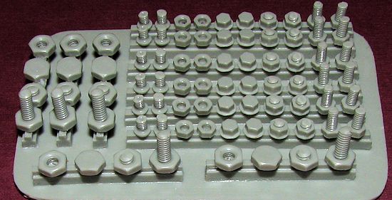 For their last set of nuts and bolts, True Details moves to 1/16 scale. In this set you get two different sizes of hardware. In total there are still 80 pieces with 36 bolt heads, 36 threaded nuts, 6 separate bolts and 6 separate nuts. No sizes are provided for these, but it seems they are 'big' and 'smaller'. Not very scientific, but they are very nicely cast and if you are into the bigger side of armor building, these will come in handy when you start getting to the stage where removing panels to see stuff inside gets to be important