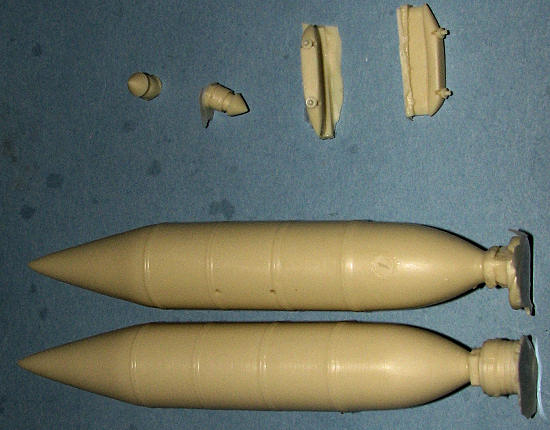 includes two tanks, two tank tips, and a pair of wingtip pylons. These latter items are much more detailed that those molded on the kit tank and are deeper. The resin tanks themselves have somewhat better detailing than the plastic (a properly recessed filler cap, for instance) and are pre-drilled for the pylons. I did notice that the resin tanks have a different shape to the tail section that, looking at photos, seems more prototypical. It also has sharper nose piece than the kit tanks and has slightly different reinforcement placements. Both will be pretty much the same length but there is a visible difference between the two. One simply removes the resin pour stubs and then uses super glue or epoxy for assembly.