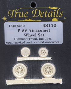 The first set is for the new Hobbycraft P-59 kit. It offers a choice of nose wheels; either the solid version as used on initial aircraft or the spoked version later used. I've noticed that TD has started providing small raised resin surfaces below the wheels to make them easier to remove from the resin. A nice touch. This set is $2.98 MSRP or $2.47 from Squadron.