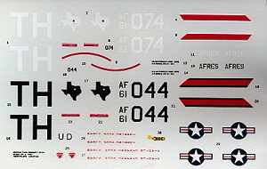 The set really doesn't havemuch in it as this conversion isn't that difficult. There is the larger fuselagespine and a set of decals. The decals cover two aircraft, one in standard SEAcamouflage with white markings and another from a few years later with an SEAwraparound camo and black markings. The decals are about the same quality asSuperscale. The image has been darkened to allow the white to show up.