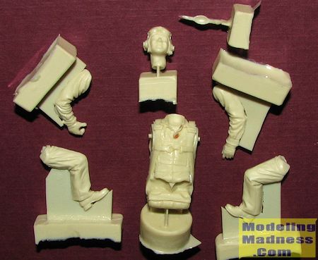 This particular figure is of Gregory 'Pappy' Boyington so is undoubtedly designed to fit into the recent Tamiya 1/32 F4U Corsair. I'm sure it would fit into any other USN/USMC aircraft of this scale as well, though it may need a little bit of work. The kit has seven parts. A seated torso, head, arms, and legs. A separate chin strap is also provided. The hands are posed to hold the controls in one hand and to be on the throttles with the other.