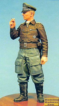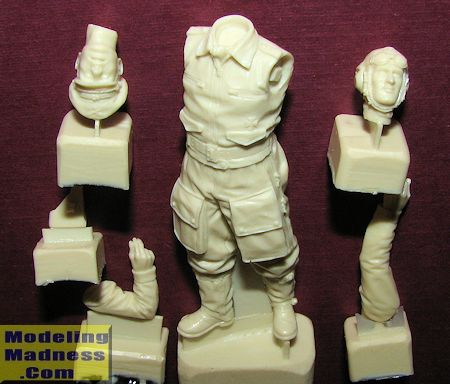 This particular figure is of a Luftwaffe fighter pilot in mid-late war garb. The figure will be very much in place with any of the many 1/32 FW-190s or Bf-109s and others in this scale. There are six parts to this figure. A main body with separate arms and a separe sidearm. Two different heads are provided, one with the peaked cap and the other in flying cap and goggles.