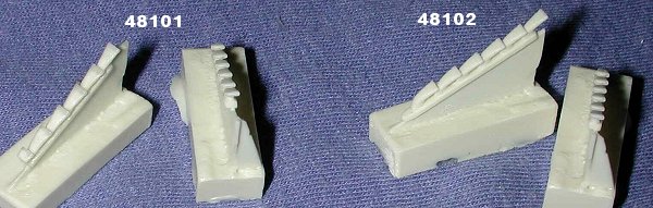 After a bit of a hiatus (undoubtedly due to the holidays), Ultracast has released some new items. These particular bits are replacement exhausts for the Hasegawa's Ju-87 Stuka family. There are two sets of exhaust. # 48101 is for the Ju-87B and #48102 is for the later Ju-87D/G series. The Ju-87B set has 5 1/2 stubs as is standard for this version because the front stubs are partially covered by the engine cowling. As with earlier exhausts, these are superbly molded with no flaws. They are on Ultracast's easy to remove resin block and the ends are indented so that a touch of black paint makes them look hollowed out. A large improvement over the kit versions.