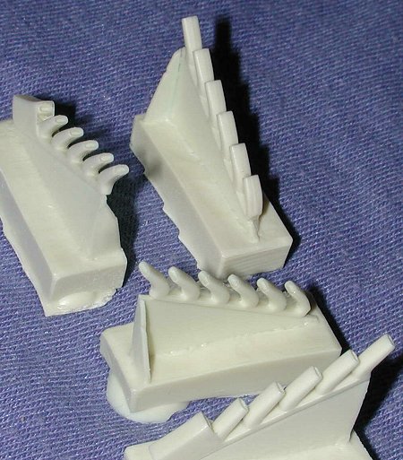 Following on the heels of their new Mossie exhausts come this superb set for the Tamiya Do-335. Like the earlier set, the casting on these is exquisite and totally flawless. The end of the exhausts is hollowed out so that the application of some flat black paint will complete the illusion of drilled out exhaust. A complete set for both front and rear engines is provided. Just like on the real aircraft, the set for the front engine is a bit different from the rear. As with all their exhaust sets, they are molded on a very thin section of resin so none of the usually tedious scraping and sanding is needed as with many other resin offerings. A few deft swipes with a sharp hobby knife blade is all that is generally needed. Highly recommended for your next Tamiya 'Pfiel' kit.