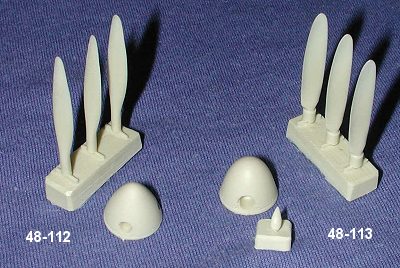 From Ultracast comes the latest in their series of bits for the 1/48 Spitfire. These two sets are for the Hasegawa and Tamiya kits. Set 48-112 is a De Havilland 3 bladed prop and spinner for the Spit I/II/V. Set 113 is a Rotol prop and the blunt spinner for the Spit II/V. It includes the little bumb on the starboard side of the nose to clear the Coffman starter.
