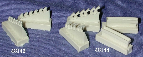 This latest set of releases are exhaust for P-40s. Set 48143 is tubular exhaust as used on the early P-40B/C aircraft and are designed specifically for the Academy/Hobbycraft kit. Cost for this set is $4.95 US/$5.95 Canadian. The other set, 48144, is for the P-40F-N and is designed for the AMT kits. These are 'flared' exhaust. This set also includes an additional recess that you glue behind the exhaust grilles. The exhaust themselves are in three pairs for each side instead of the single exhaust that is provided in the kit. Cost for this set is $5.95 US/$7.95 Canadian.