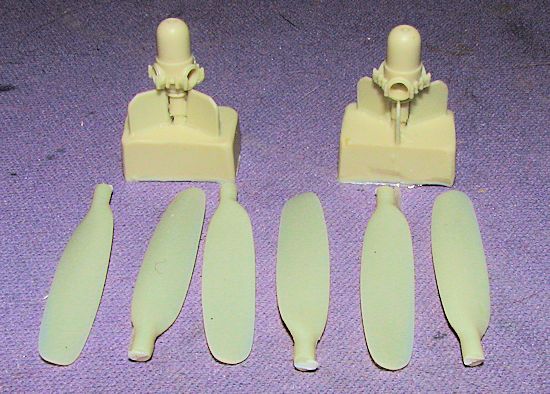 This is the second of two prop sets from Ultracast. This set has two complete props. These have the 23-E-50 hub with the 6477A-0 blades. These props were used onB-17F/G, B-24s, C-47s, and DC-3s. The sets are superbly molded and one only has to remove the hubs from the mold blocks (a sharp knife will do it), and sand down the roots of the prop blades. Then simply slide them into the holes in the hubs. These are the paddle blades blades so one really needs a photo reference if the aircraft type being modeled used both types. For the B-17 and B-24, a second set will need to be purchased to do all four engines.