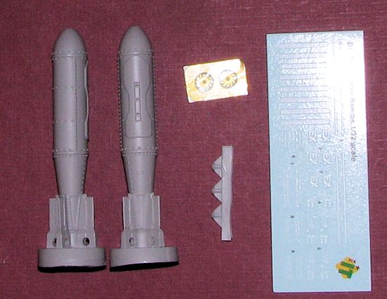 The set comes with a nice decal sheet which is pretty much white lettering and stripes. There is a full color instruction sheet that shows were all the markings are to be applied and this includes photos of the actual bombs. The bombs themselves measure a bit over 3 inches in length.