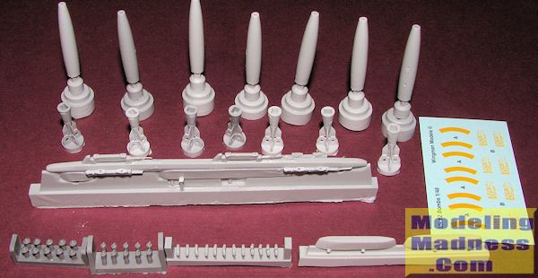 This latest set from 'Fix it' is a weapons set for the Kfir/Nesher. There are a couple of kits of these two planes available so finding one should not be an issue. The set includes a Multiple Ejection Rack (MER), two fuselage mounted single bomb racks, seven two-piece bombs, two optional fuse types and a set of anti-sway braces for the MER. There is also a decal sheet for the bombs. Note that on the Nesher/Kfir, only five bombs were mounted on the MER, hence the inclusion of seven bombs. The resin is first rate and you get full assembly and installation instructions.
