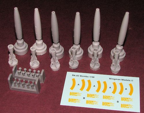 This latest set from 'Fix it' comprises some good old Mk.82 500 lb iron bombs. The set includes six two-piece bombs with the fin sections separate from the main body as on the real bombs. There is a well defined pin and socket on these parts to ensure positive alignment. You also get a choice of fuses for the nose of the bombs as well as a nicely done decal sheet that includes the yellow nose bands and stencils, something you do not often get on aftermarket weapons sets. These are appropriate for a wide range of aircraft from the Vietnam War to modern days.