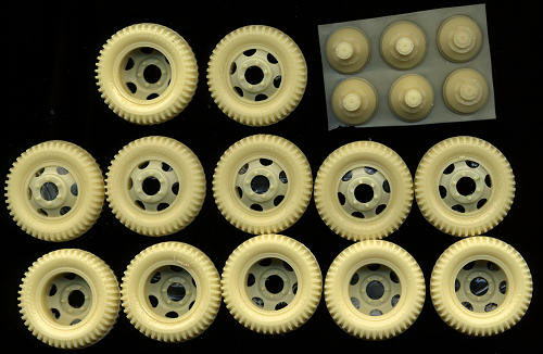 This appears to be the first set of resin upgrade parts from Your Scale Models Kits of Ukraine. The set includes 12 superbly detailed resin wheel/tire combinations with accurately molded tread pattern and properly long wheel studs jutting from the wheel. Also included are six wheel hubs; four long for dualies and two short for the fronts. These also have stud detail on them, though if you are going to add the wheels, you will need to remove these. However, having them included allows for some diorama
