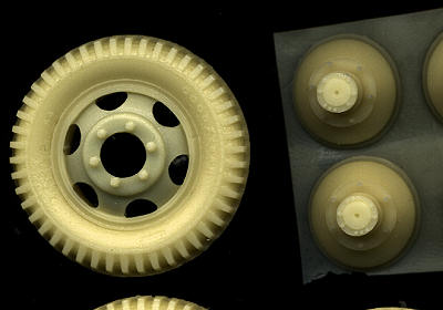 The set comes with instructions on use. One will need to drill the appropriate size hole for the axles as these wheels are designed for a number of different US and Soviet trucks from ICM, Italeri, Tamiya and Heller. I am sure you can get these to fit other company's similar products. To do the dualies, one simply removes the bolt pattern from one side of the wheel and joins them together. As you can see from the close-up of the hubs and a wheel, the molding is first rate. The mold seam on these wheels is along the circumference, making it easy to remove.