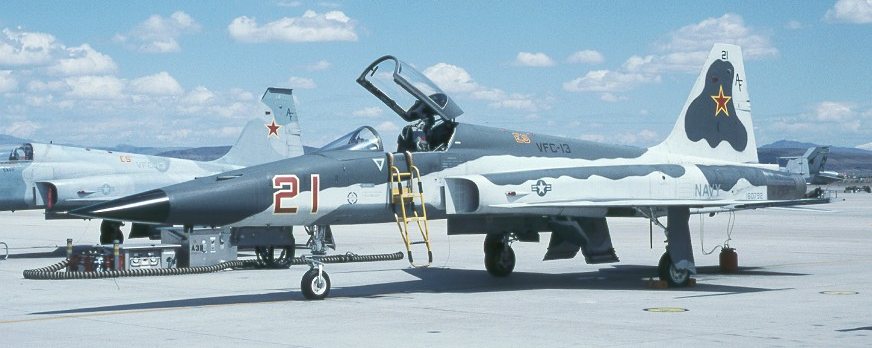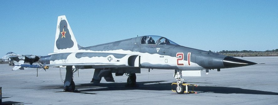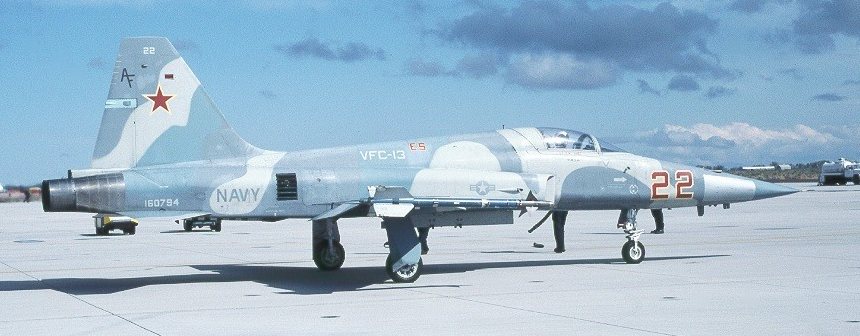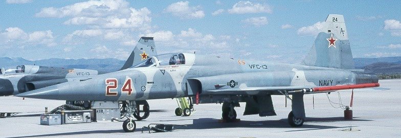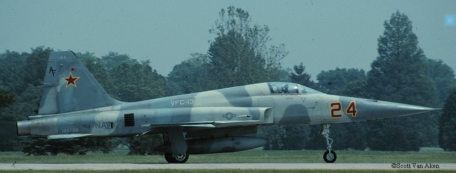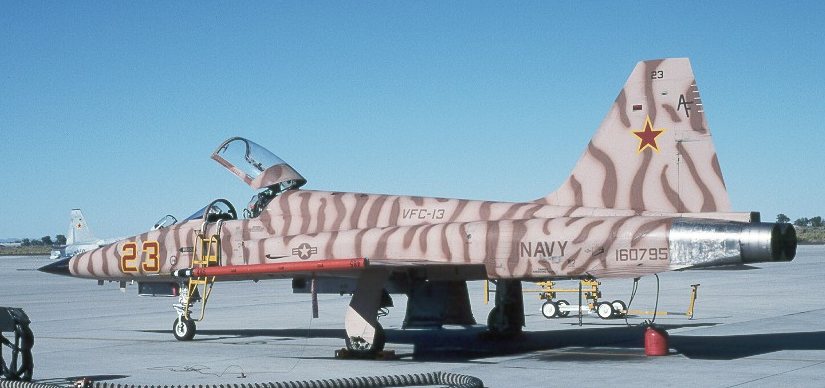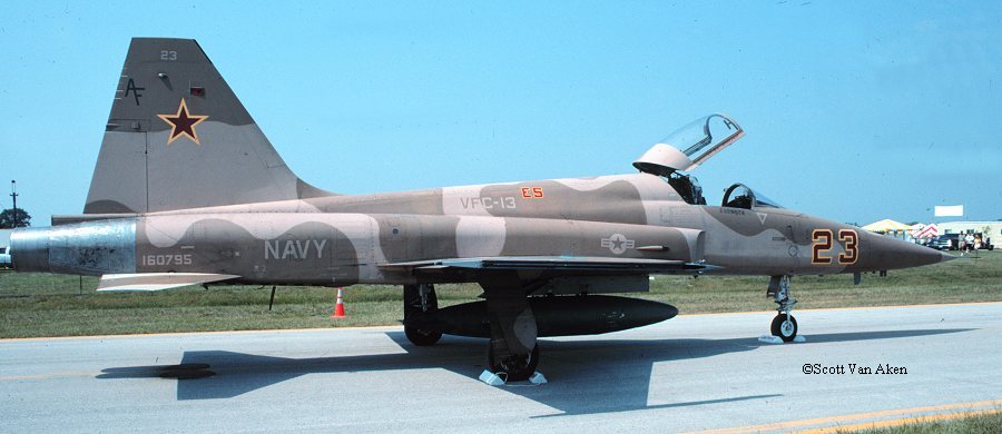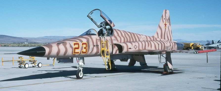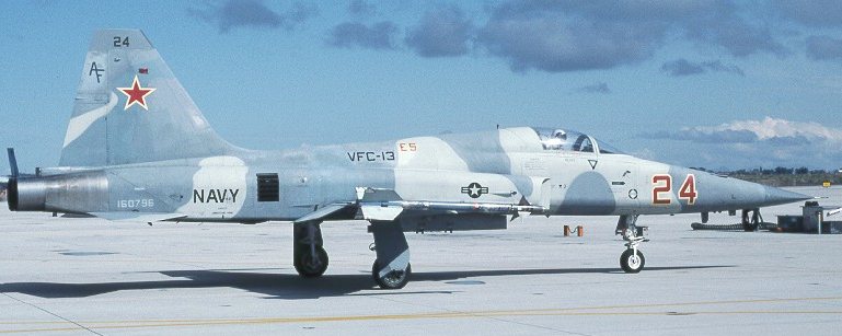 This a/c starts the numbering sequence of the original USN F-5Es. It is a veteran machine that has seen service with most of the Navy units that have flown the Tiger II. While in service with VFA-127, this a/c was painted in an overall gloss black scheme with red markings, akin to the "MiG-28s" from the movie Top Gun. Carpena Decals has markings for this a/c on their sheet #48-37.