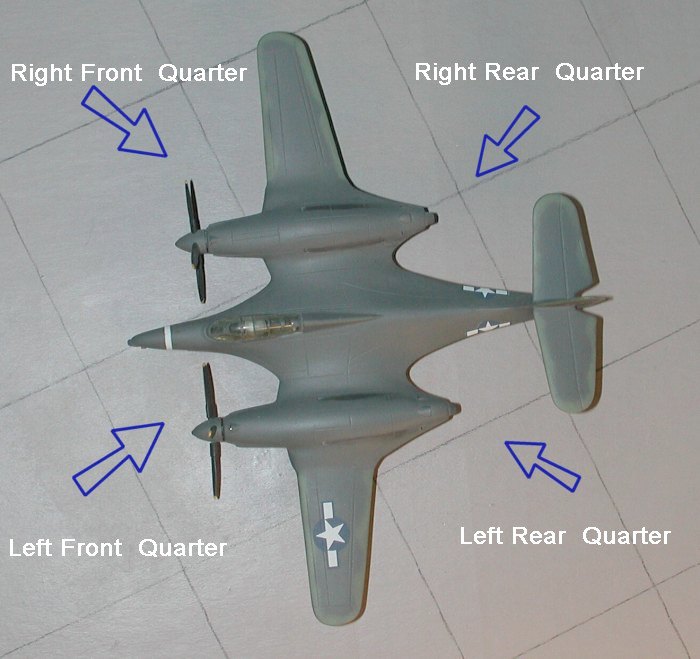 Well, long ago, I came up with something that works well for me. But first, a bit of nomenclature so that we are all on the 'same page'. I think we all can relate to 'head on' and 'tail on' as well as 'profile'. In between those are the 'quarter views'. The accompanying image shows those parts and this applies to any object, not just aircraft.